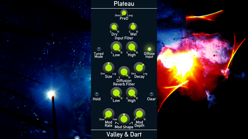 "Plateau is a plate reverb module based on the famous, Dattorro (1997) design, and is designed to make a dry, lifeless patch sound lush, deep and spacious. However, unlike other reverberators, Plateau attempts to go beyond, providing a wide variety of control combinations and options."